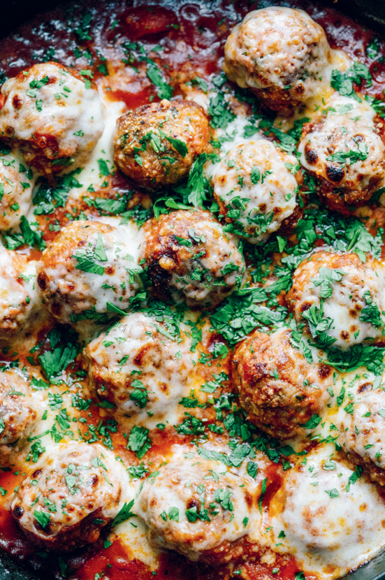 Preheat the oven to 475°F / 245°C. Warm a thin layer of oil in an ovenproof skillet over medium heat. Form the chicken mixture into small balls and, once the oil is hot, sear the balls. About 3 minutes per side until the outsides are just golden (these can also be roasted for 15 minutes). Turn the heat to low, pour the marinara over the balls, and stir gently. Let the marinara warm up for a few minutes. Put a piece of the mozzarella on top of each ball, plus a sprinkle of Parmesan, and put the pan in the oven for 6 to 8 minutes until the cheese is just golden.